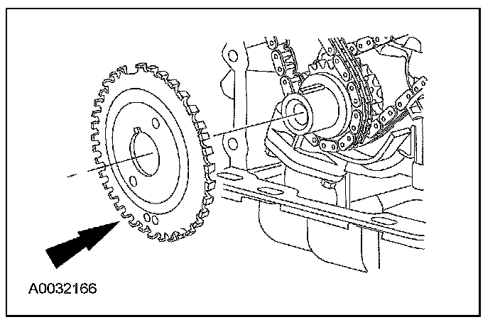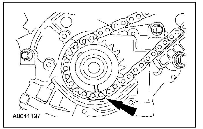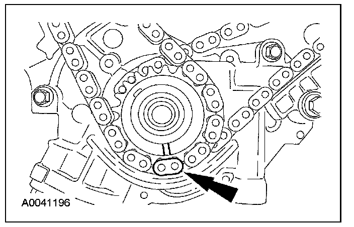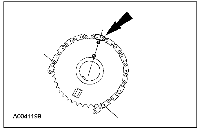 9. Install the LH timing chain on the camshaft sprocket, aligning the copper (marked) link with the timing marks on the sprocket.