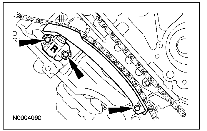 14. Position the RH timing chain tensioner arm on the dowel pin and install the RH timing chain tensioner.