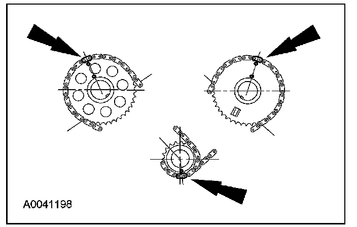 3. Rotate the crankshaft until the timing mark on the RH camshaft sprocket is approximately at the 11 o'clock position and the timing mark on the LH camshaft sprocket is approximately at the 1 o'clock position.