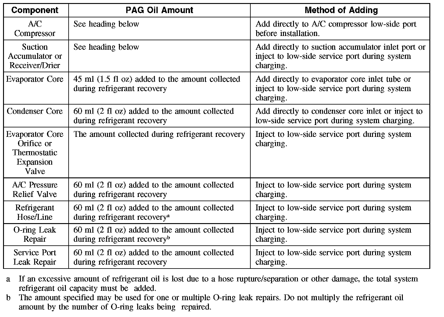 NOTE: During normal A/C operation, oil is circulated through the system with the refrigerant, and a small amount is retained in each component. If certain components of the system are removed, some of the refrigerant oil will go with the component. To maintain the original total oil charge, it is necessary to compensate for the oil lost by adding oil to the system with the new part.