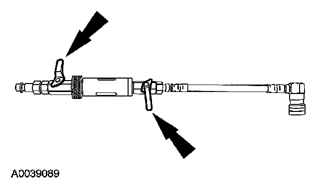 5. Install the dye/lubricant injector between the low-side service gauge port valve and the refrigerant service station or manifold gauge set.