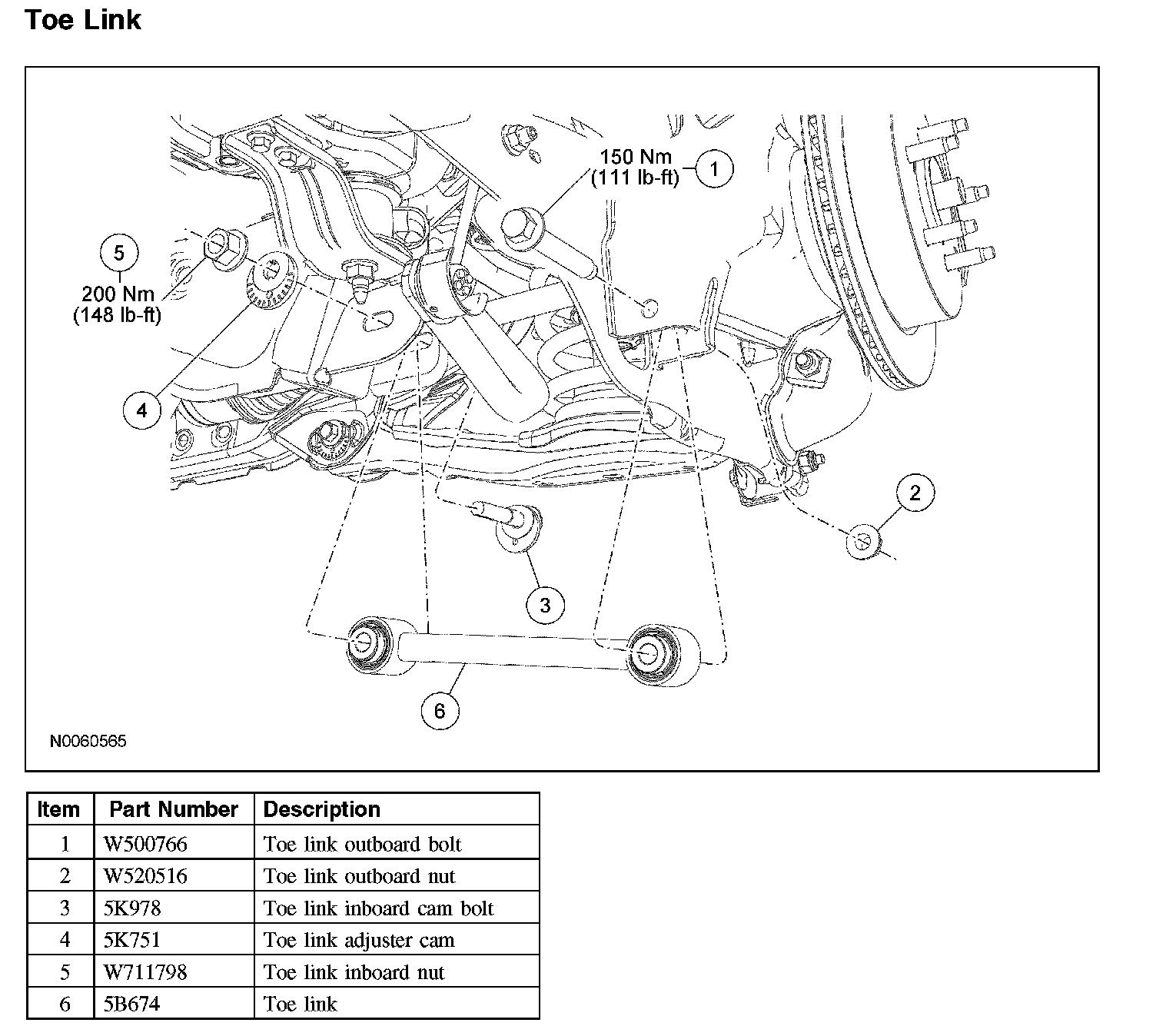 5. With the weight of the vehicle on the wheel and tire, tighten the toe link inboard nut to 200 Nm (148 lb-ft).