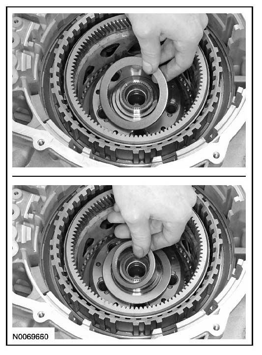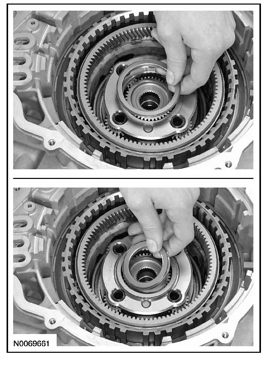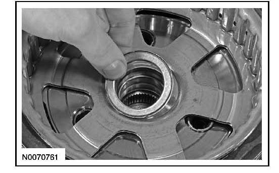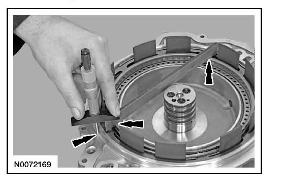 89. Measure the depth of the low/reverse clutch pressure plate where the tab fits into the gap of the low one-way clutch snap ring and directly across from it. If the pressure plate is seated correctly, the depth should be the same. If the depths are different, rotate the snap ring so that the gap fits around the tab on the pressure plate.