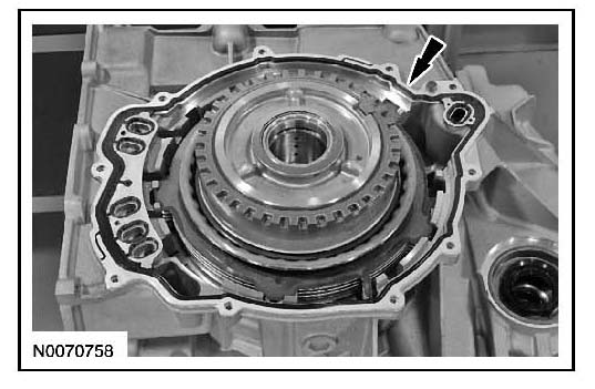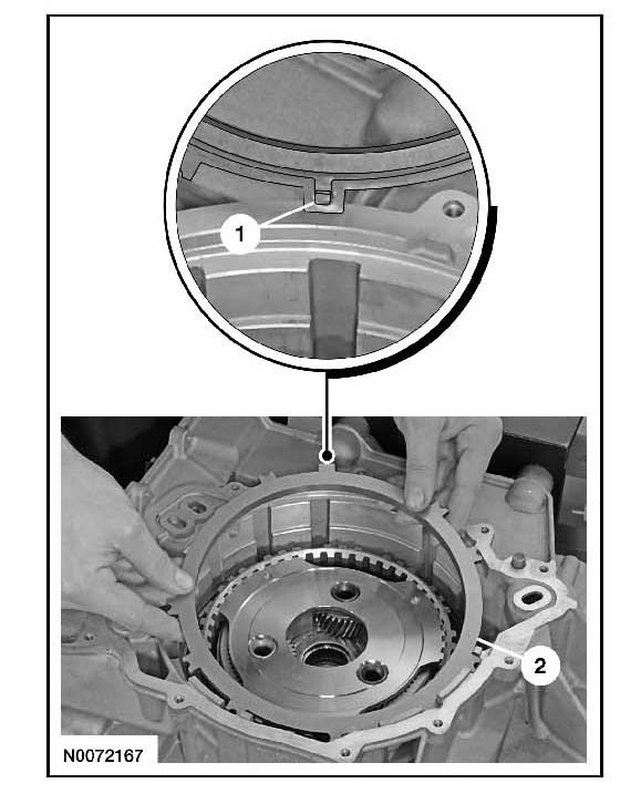 88. CAUTION: Failure to align the tab on the bottom of the low/reverse pressure plate with the gap in the low one-way clutch snap ring may result in damage to the transaxle.