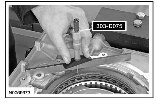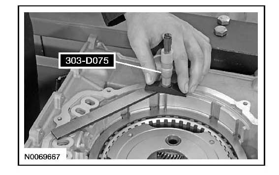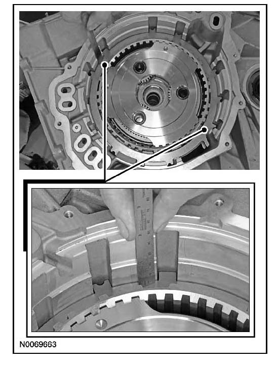 100. Using a suitable straightedge and Depth Micrometer 303-D075, measure and record as measurement A, the distance from the transaxle case deck surface to a low point on the intermediate clutch wave spring.