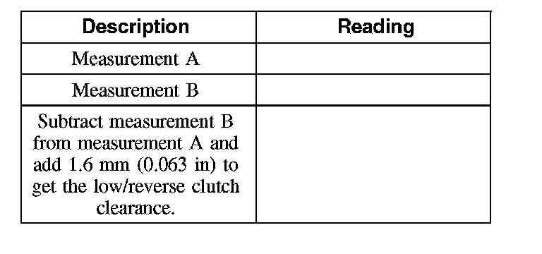 95. Subtract measurement B from measurement A and add 1.6 mm (0.063 inch), to compensate for the thickness of the gasket, to get the low/reverse clutch clearance. The clearance should be between 1.01 mm (0.040 inch) and 2.47 mm (0.1 inch). If the clearance is out of range, check the low/reverse clutch pack for correct installation. If the low/reverse clutch pack is correctly installed, install a new low/reverse clutch pack.