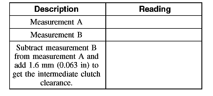 102. Subtract measurement B from measurement A and add 1.6 mm (0.063 inch), to compensate for the thickness of the gasket, to get the intermediate clutch clearance. The clearance should be between 0.90 mm (0.035 inch) and 2.24 mm (0.088 inch). If the clearance is out of range, check the intermediate clutch pack for correct installation. If the intermediate clutch pack is correctly installed, install a new intermediate clutch pack.