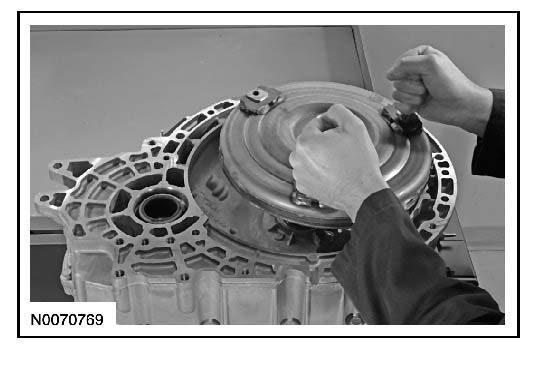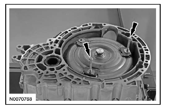 122. CAUTION: Only thread the bolts 6 to 8 turns or do not exceed 12 mm (0.472 inch) in the torque converter. If the bolts are threaded too far, damage to the torque converter clutch surface can occur causing torque converter failure.