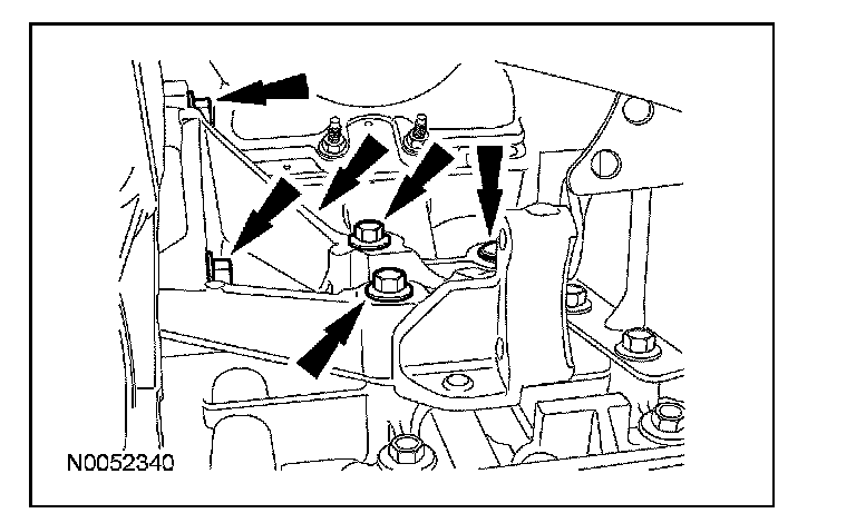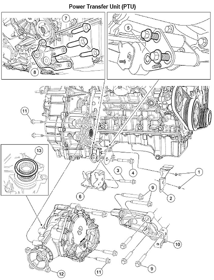 12. Remove the 3 RH side PTU-to-transaxle bolts and the 2 LH side PTU-to-transaxle bolts previously loosened.