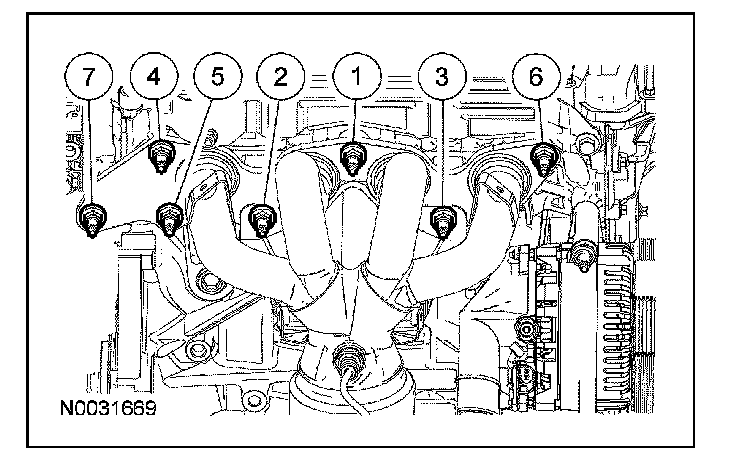 Position the catalytic converter and tighten the 7 new exhaust manifold nuts in the sequence shown in 2 stages: