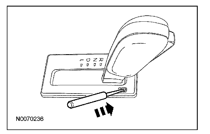3. Using a suitable tool, depress the brake shift interlock override mechanism on the selector lever, apply the brake, depress the button on the selector lever and move the selector lever into NEUTRAL.