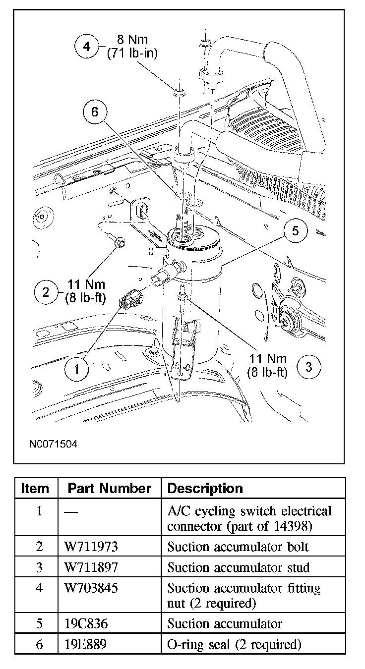 NOTE: Installation of a new suction accumulator is not required when repairing the A/C system, except when there is physical evidence of contamination from a failed A/C compressor or damage to the suction accumulator. Damage to the suction accumulator includes leaks in the suction accumulator, physical damage to the suction accumulator shell or desiccant, or moisture contamination. Moisture contamination results only from a complete loss of refrigerant, and equalization of the refrigerant system pressure with atmospheric pressure for a period longer than 1 hour. If even a slight amount of positive refrigerant pressure is present in the refrigerant system before repairs are carried out, the suction accumulator should not be replaced.