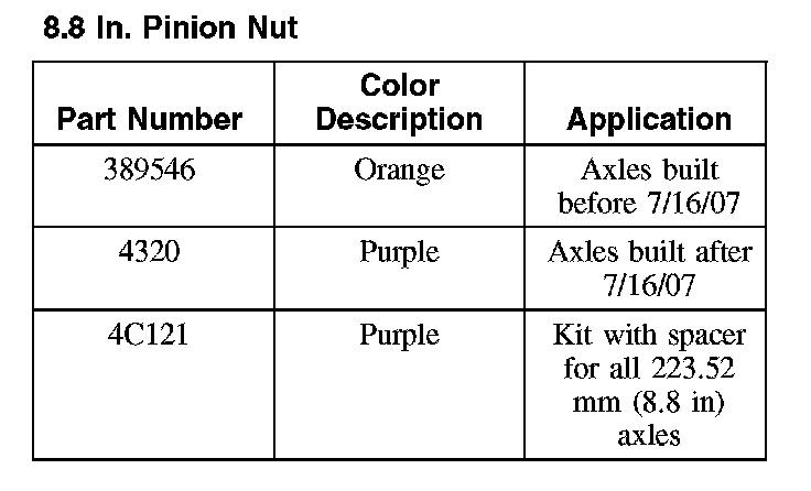 1. CAUTION: The color on the rear face of the drive pinion nut is critical to this repair. Use the same color new drive pinion nut for installation. If a new collapsible spacer must be installed for pinion bearing preload reduction, install the nut supplied with the new spacer kit or damage to the component may occur.