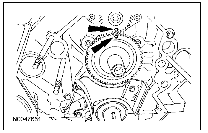 4. Install the engine dynamic balance shaft drive gear on the camshaft. Make sure the timing marks on the drive gear and driven gear are lined up.