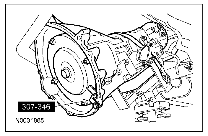 2. CAUTION: To position the transmission in the vehicle, put the transmission into a nose-down position on a suitable transmission jack. This allows the tail shaft to go over the exhaust system. The converter housing is piloted into position by dowels in the rear of the engine block. The torque converter must rest squarely against the flexplate. This indicates that the converter pilot is not binding in the engine crankshaft.