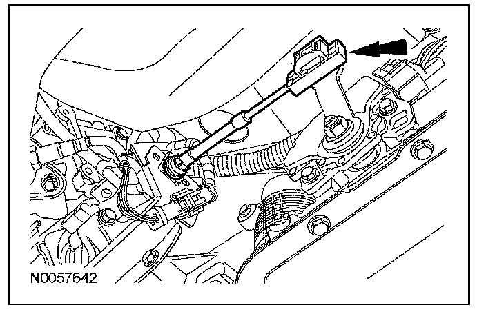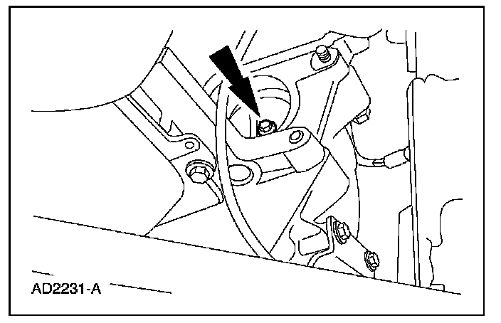 28. NOTE: When installing the selector lever cable, make sure that the selector lever cable locking tabs are locked in place and the selector lever cable end is snapped onto the ball stud. Press the selector lever cable into the selector lever cable bracket and listen for the selector lever cable to click in place. Pull back on the selector lever cable to make sure that it is locked into the selector lever cable bracket. Also make sure that the selector lever cable end is correctly installed onto the ball stud. Pull back on the selector lever cable end to make sure that the selector lever cable end is correctly installed.