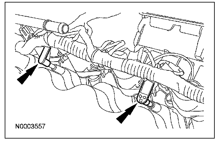 13. Disconnect the 2 engine wiring harness retainers from the RH valve cover studs.