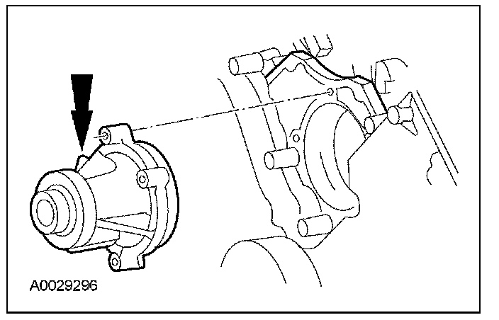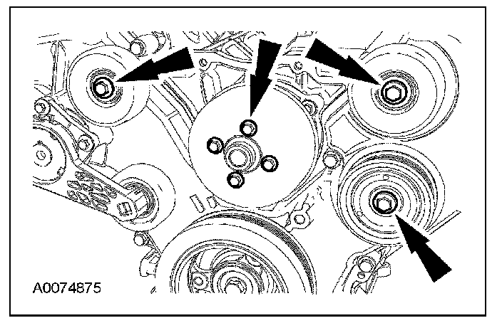 34. Remove the bolts, the coolant pump pulley and the 3 accessory drive belt idler pulleys.