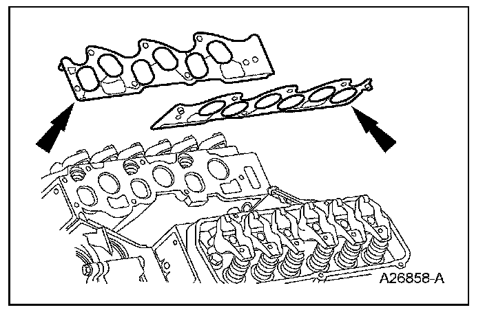 1 Apply a bead of silicone gasket and sealant to the lower intake manifold gaskets and front and rear seal junctions in 4 places as shown.