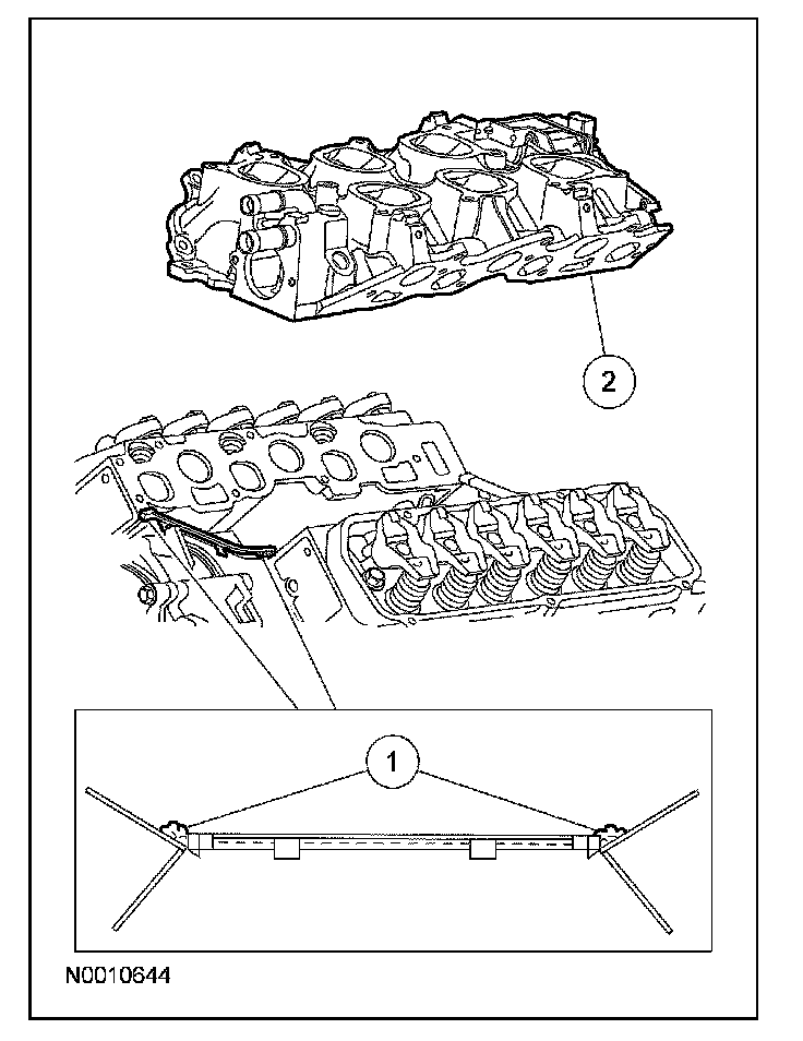 1 Apply a bead of silicone gasket and sealant to the intake manifold front and rear seal mounting points as indicated.