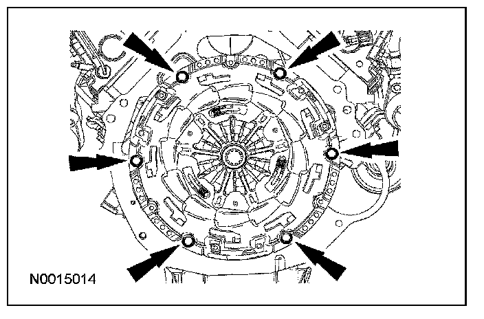 Position the clutch pressure plate and the clutch disc and install the 6 bolts.