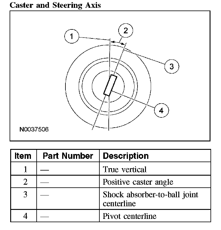 Caster is the deviation from vertical of an imaginary line drawn through the ball joints when viewed from the side. The caster specifications will give the vehicle the best directional stability characteristics when loaded and driven. The caster setting is not related to tire wear.