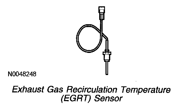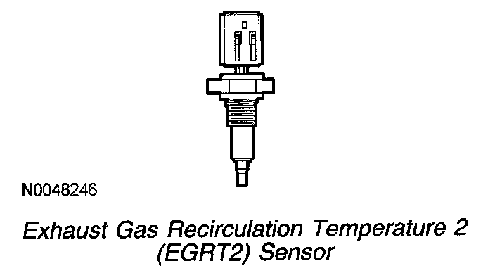 The EGRT sensor is a thermistor device that monitors the exhaust gas temperature before the EGR coolers. The electrical resistance of a thermistor decreases as the temperature increases, and resistance increases as the temperature decreases. The varying, non-linear resistance affects the voltage drop across the sensor terminals and provides an electrical signal to the PCM that corresponds to measured temperature.