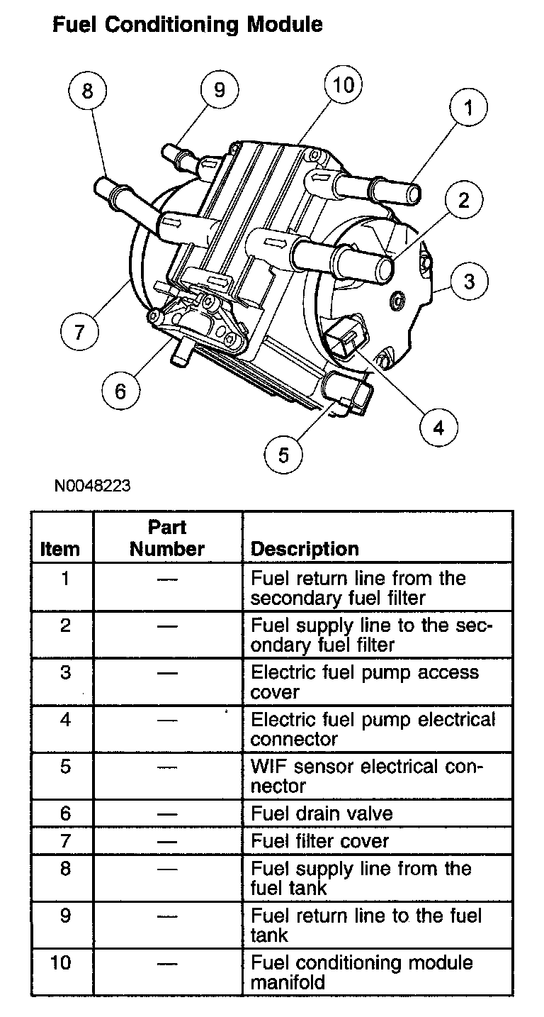 The electric fuel pump draws fuel from the fuel tank through the 1.27 cm (1/2 inch) fuel supply line. When the fuel enters the fuel conditioning module it flows through the 10 micron fuel filter which separates particles and removes water from the fuel. The separated water collects at the bottom of the pump. If enough water is collected, the WIF sensor detects it and the PCM turns the WIF indicator ON. The conditioned fuel is then delivered to the secondary fuel filter.