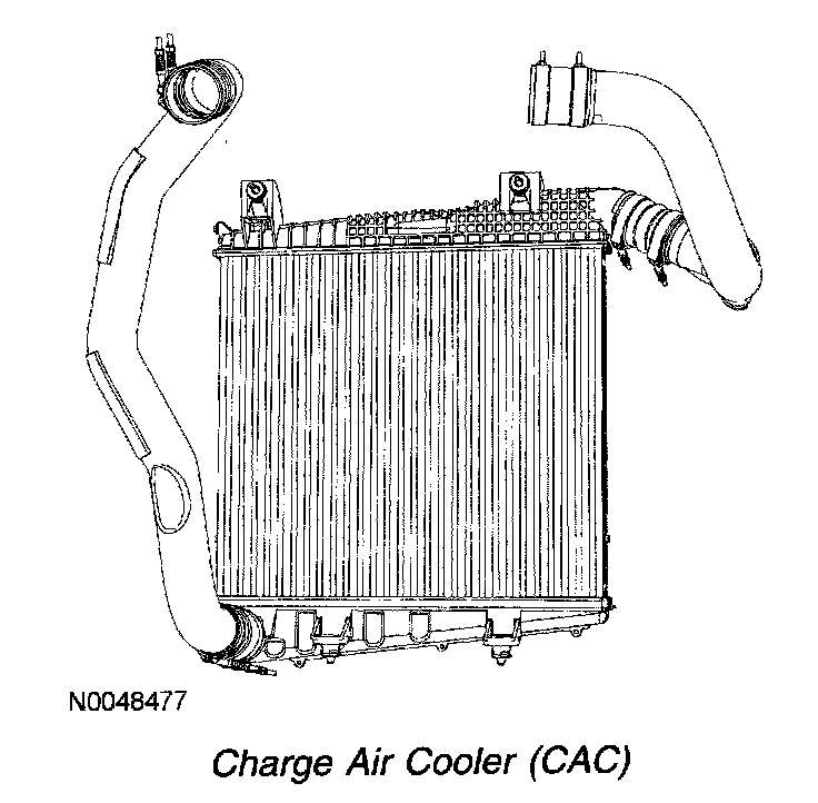 The CAC is composed of a radiator mounted in the grill of the vehicle and the tubing used to connect the output of the turbocharger to the intake of the engine. The CAC is designed to cool the induction air which has been heated by the turbocharger. As the heated air flows through the CAC, heat is transferred to the outside air reducing the temperature of the intake air.