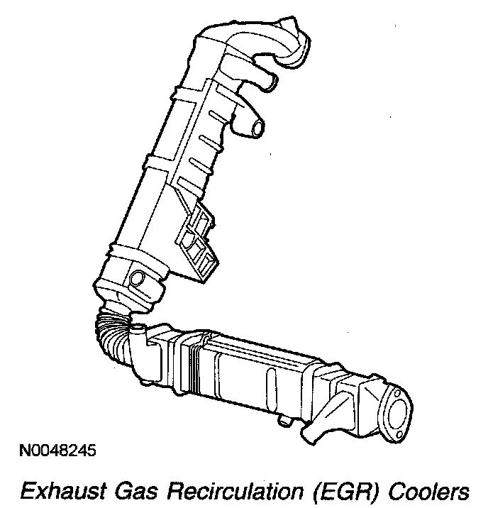 The exhaust gasses are directed through 2 EGR coolers to remove heat before the gasses arrive at the EGR valve. Engine coolant is used to reduce the exhaust gas temperature by directing coolant flow through the EGR coolers.
