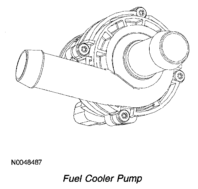 The fuel cooler pump is mounted to the cooling fan shroud on the driver's bottom side and it circulates the coolant which cools the fuel in the fuel cooler system. The PCM commands the fuel cooler pump on by grounding the pump circuit when the fuel temperature exceeds the calibrated threshold.