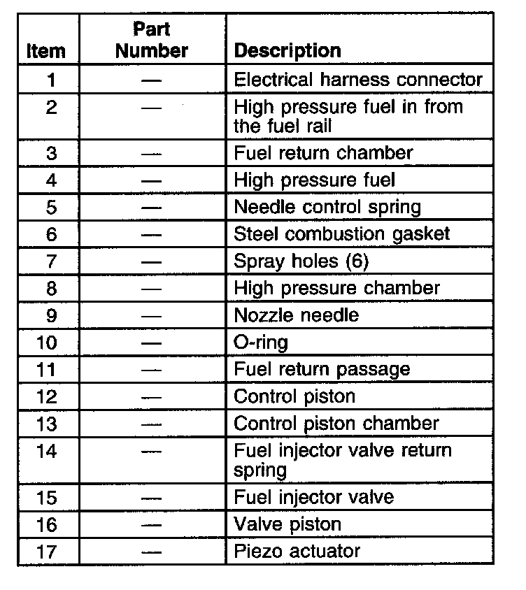 The piezo actuator consists of a series of small disks. When the piezo actuator is electrically energized, it causes the disks to deform which results in an expansion. The expansion generates a longitudinal motion which pushes downward against the valve piston. The piezo actuator returns to its non-energized state by fuel and spring pressure during engine operation, and by the spring pressure from the fuel injector valve return spring when the engine is shut down.