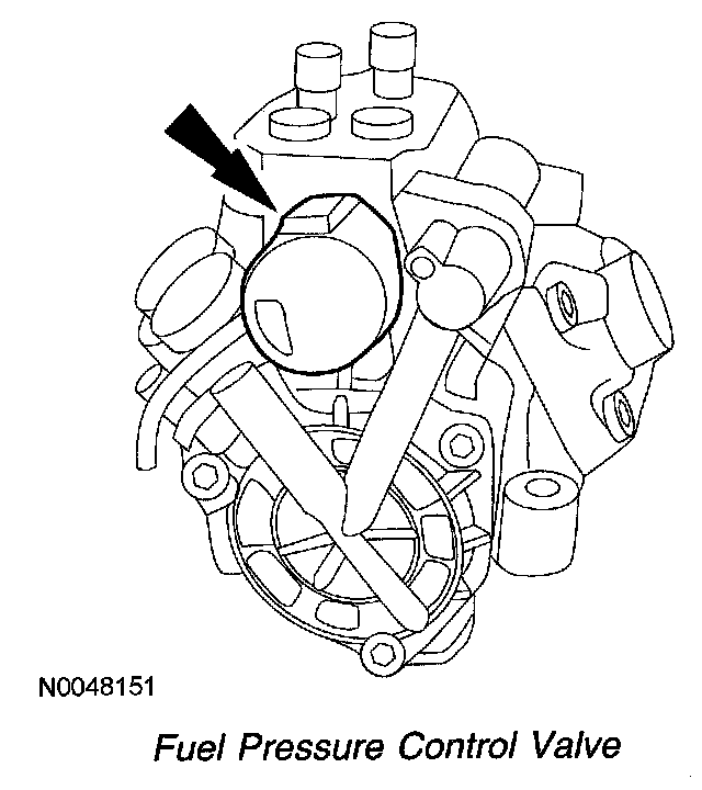 The PCM controls the fuel rail pressure (FRP) by activating the fuel pressure control valve which regulates the fuel pressure at the outlet of the high pressure fuel injection pump. The PCM regulates FRP by controlling the on/off time of the fuel pressure control valve solenoid. An increase or decrease in the on/off time positions maintains pressure in the fuel system or vents pressure to the fuel cooler. A high duty cycle indicates a high FRP is being commanded. A low duty cycle indicates less pressure is being commanded. The fuel pressure control valve is mounted on the top rear of the engine in the high pressure fuel injection pump cover and is integrated to the high pressure fuel injection pump.