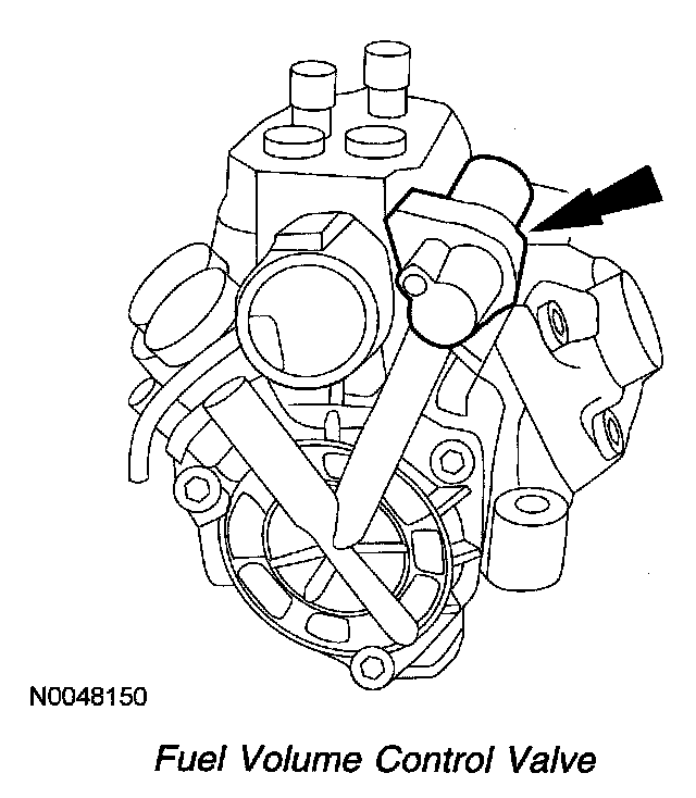 The PCM controls the volume of low pressure fuel that enters the inlet one-way check valve and 3 main pump pistons by activating the fuel volume control valve. The PCM regulates fuel volume by controlling the on/off time of the fuel volume control valve solenoid. A high duty cycle indicates a high fuel volume is being commanded. A low duty cycle indicates less volume is being commanded. The fuel volume control valve is mounted on the top rear of the engine in the high pressure fuel injection pump cover and is integrated to the high pressure fuel injection pump.