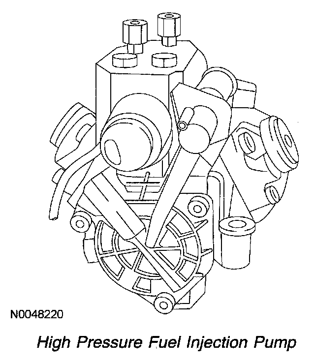 The high pressure fuel injection pump is gear driven by the camshaft gear and is located at the rear of the engine. It increases the fuel pressure from approximately 34.5-41.3 kPa (5-6 psi) up to 169.96 MPa (24,650 psi) and delivers it to the fuel rails.
