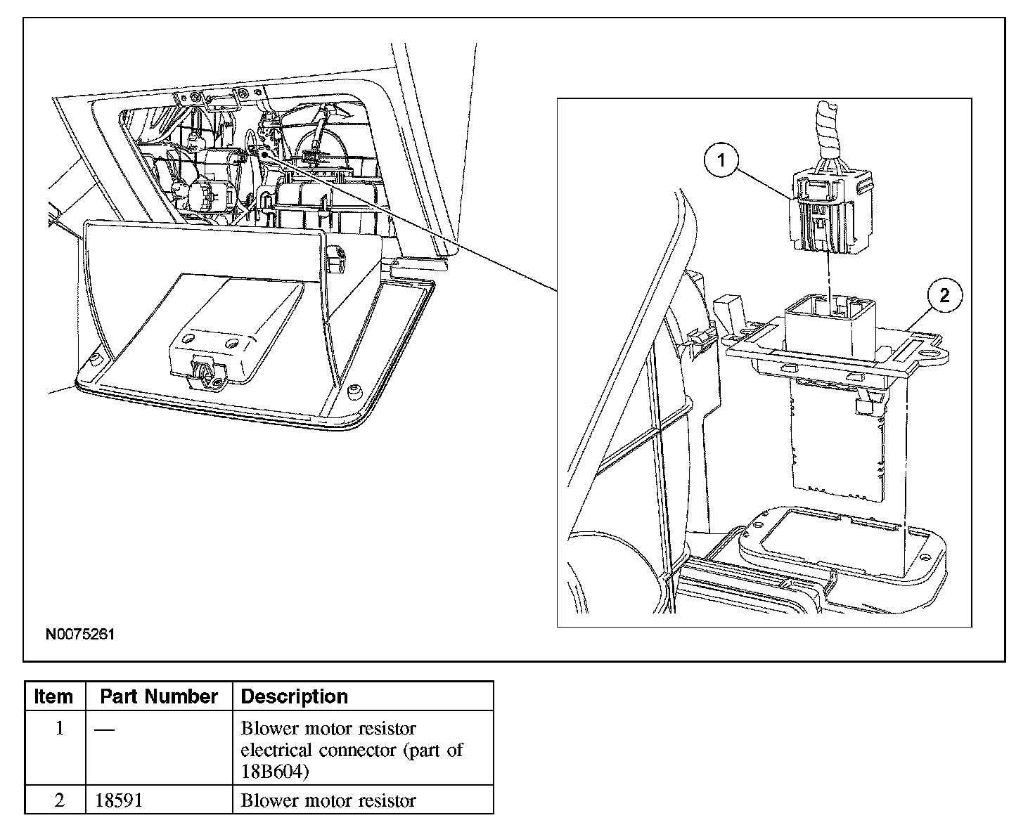 4. NOTE: The blower motor resistor is not equipped from the factory with a mounting screw. A backup screw boss is provided where a screw can be installed if the blower motor resistor does not clip securely to the heater core and evaporator core housing.
