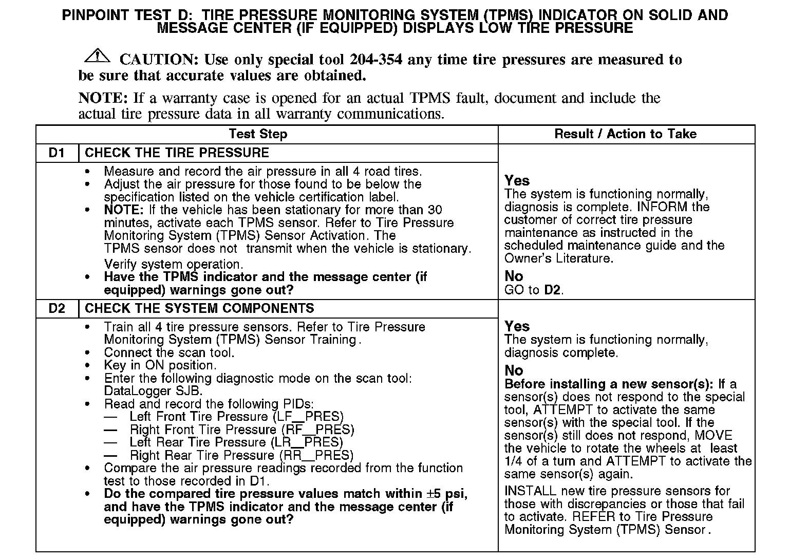 Pinpoint Test D: Tire Pressure Monitoring System (TPMS) Indicator ON Solid and Message Center (if equipped) Displays LOW TIRE PRESSURENormal Operation