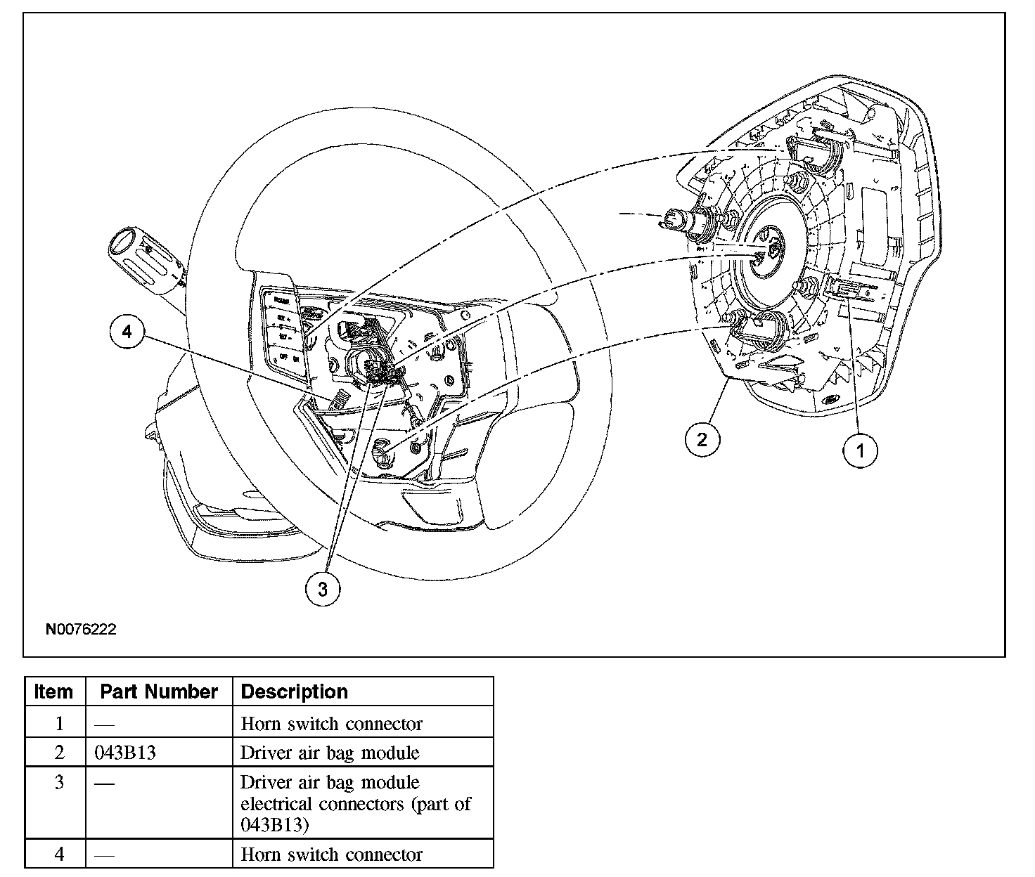 CAUTION: Do not allow driver air bag module to hang from the wiring harness. Damage to the wiring harness and connectors may occur.