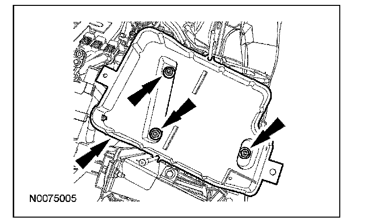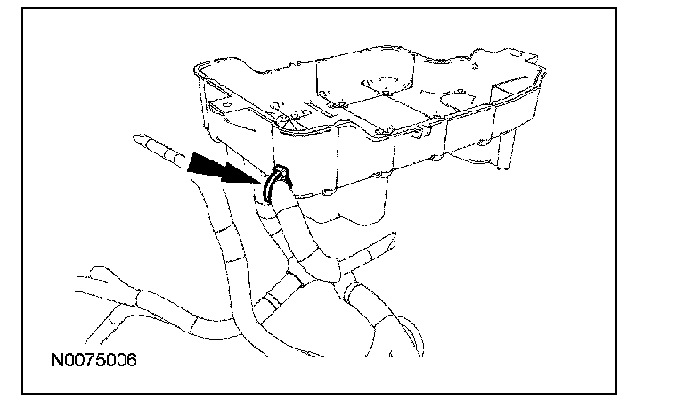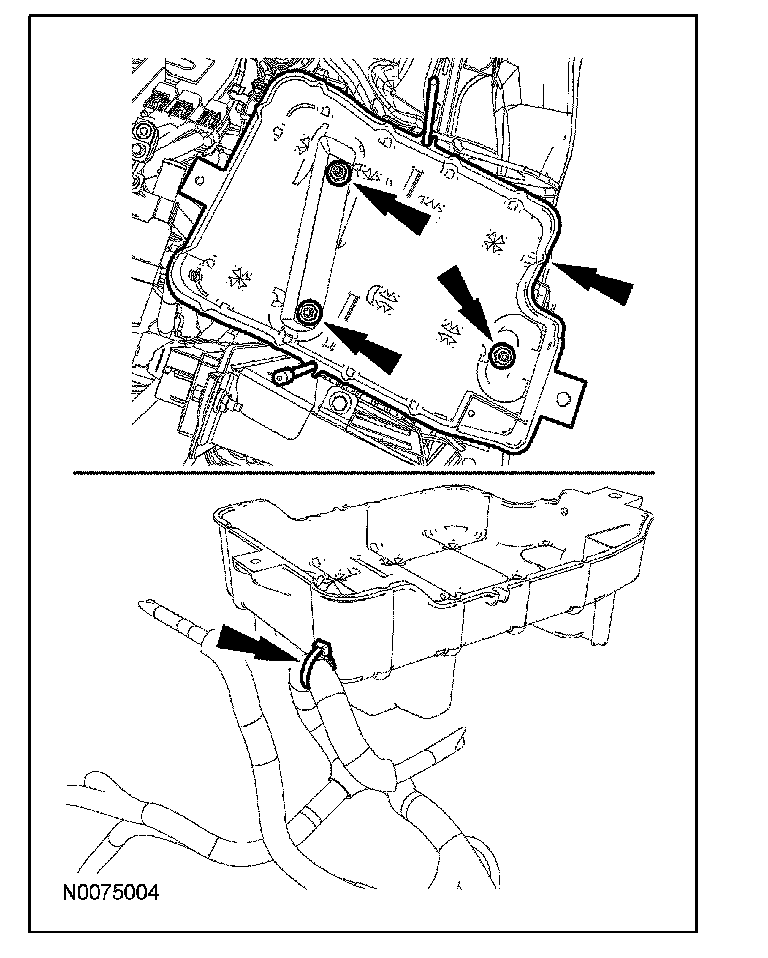 3. Remove the 3 battery tray nuts. Pull the battery tray up, disconnect the wiring harness fasteners from the battery tray and remove the battery tray.