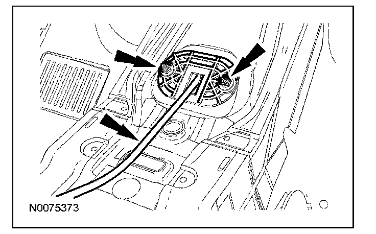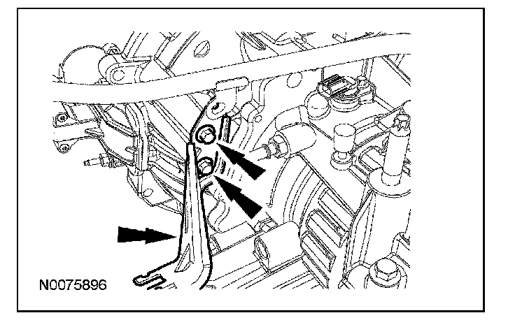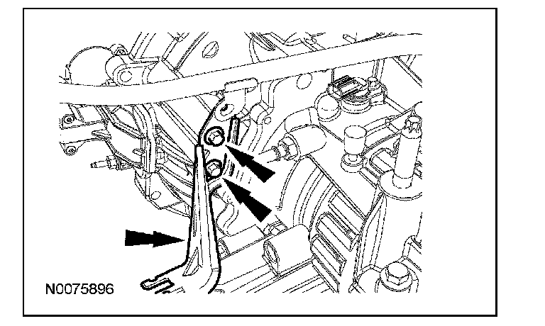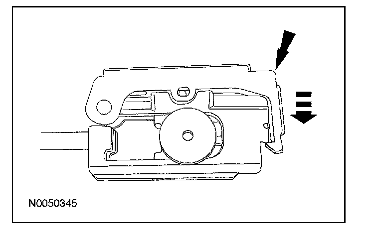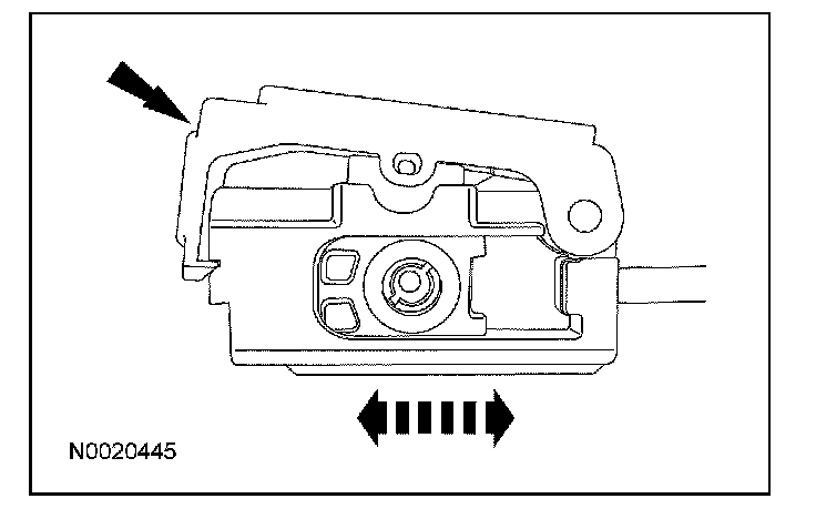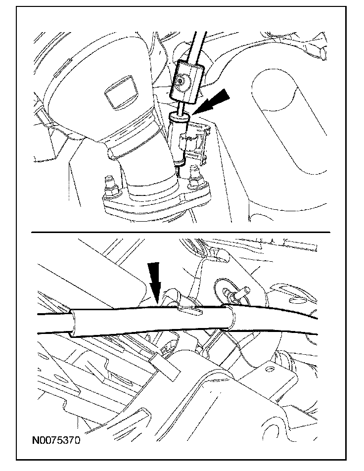 10. NOTE: When installing the selector lever cable, make sure that the selector lever cable locking tabs are locked in place and the selector lever cable end is snapped onto the ball stud. Press the selector lever cable into the selector lever cable bracket and listen for the selector lever cable to click in place. Pull back on the selector lever cable to make sure that it is locked into the selector lever cable bracket. Also make sure that the selector lever cable end is correctly installed onto the ball stud. Pull back on the selector lever cable end to make sure that the selector lever cable end is correctly installed.