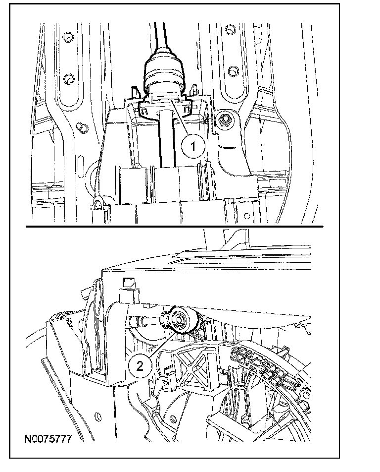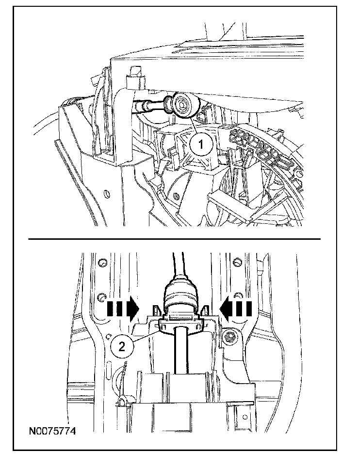 NOTE: When installing the selector lever cable, make sure that the selector lever cable locking tabs are locked in place and the selector lever cable end is snapped onto the ball stud. Press the selector lever cable into the selector lever cable bracket and listen for the selector lever cable to click in place. Pull back on the selector lever cable to make sure that it is locked into the selector lever cable bracket. Also make sure that the selector lever cable end is correctly installed onto the ball stud. Pull back on the selector lever cable end to make sure that the selector lever cable end is correctly installed.
