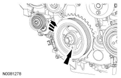 NOTICE: Do not loosen or remove the crankshaft pulley bolt without first installing the special tools as instructed in this procedure. The crankshaft pulley and the crankshaft timing sprocket are not keyed to the crankshaft. The crankshaft, the crankshaft sprocket and the pulley are fitted together by friction, using diamond washers between the flange faces on each part. For that reason, the crankshaft sprocket is also unfastened if the pulley bolt is loosened. Before any repair requiring loosening or removal of the crankshaft pulley bolt, the crankshaft and camshafts must be locked in place by the special service tools, otherwise severe engine damage can occur.