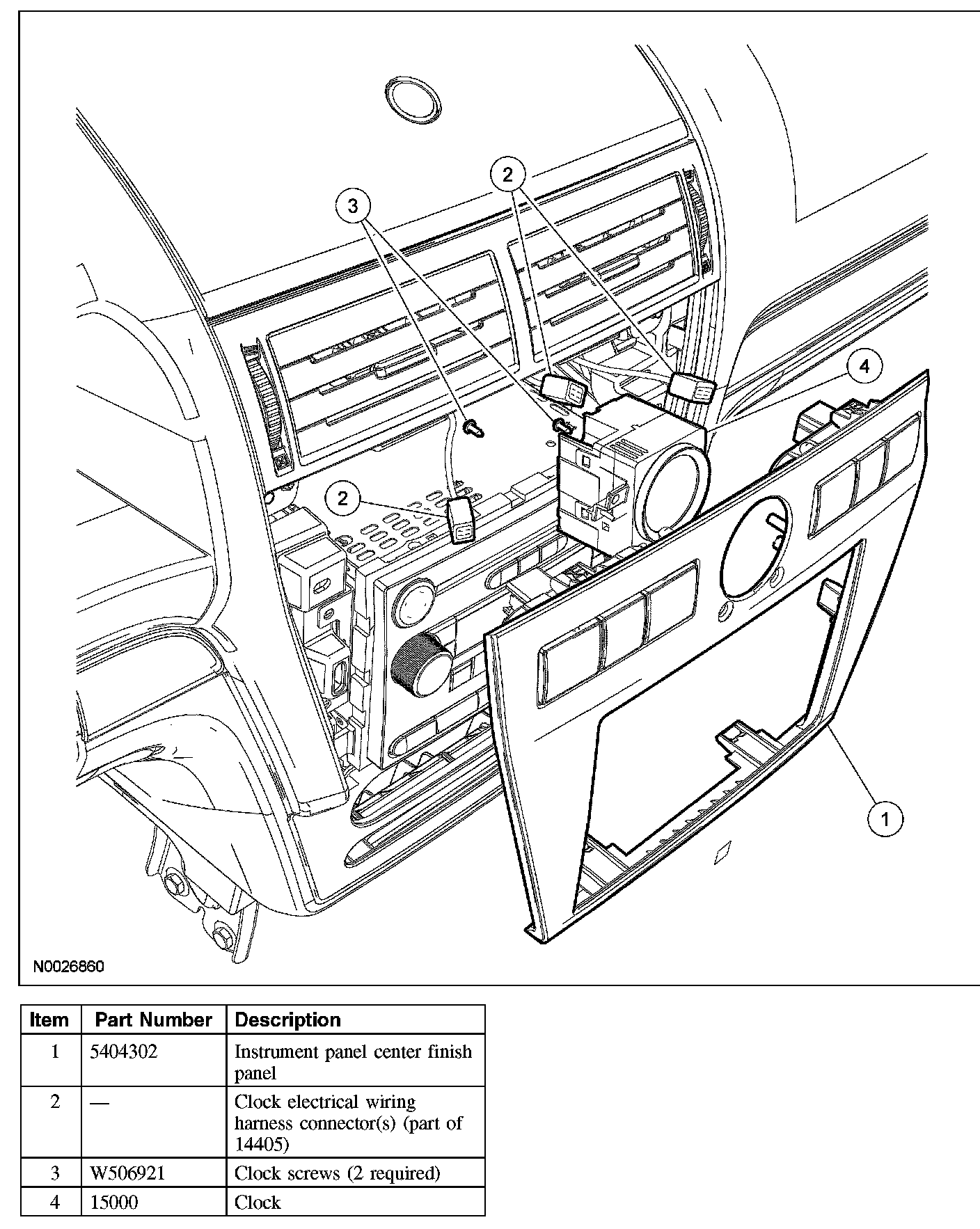 1. Remove the instrument panel center finish panel by pulling rearward to release the spring clips.