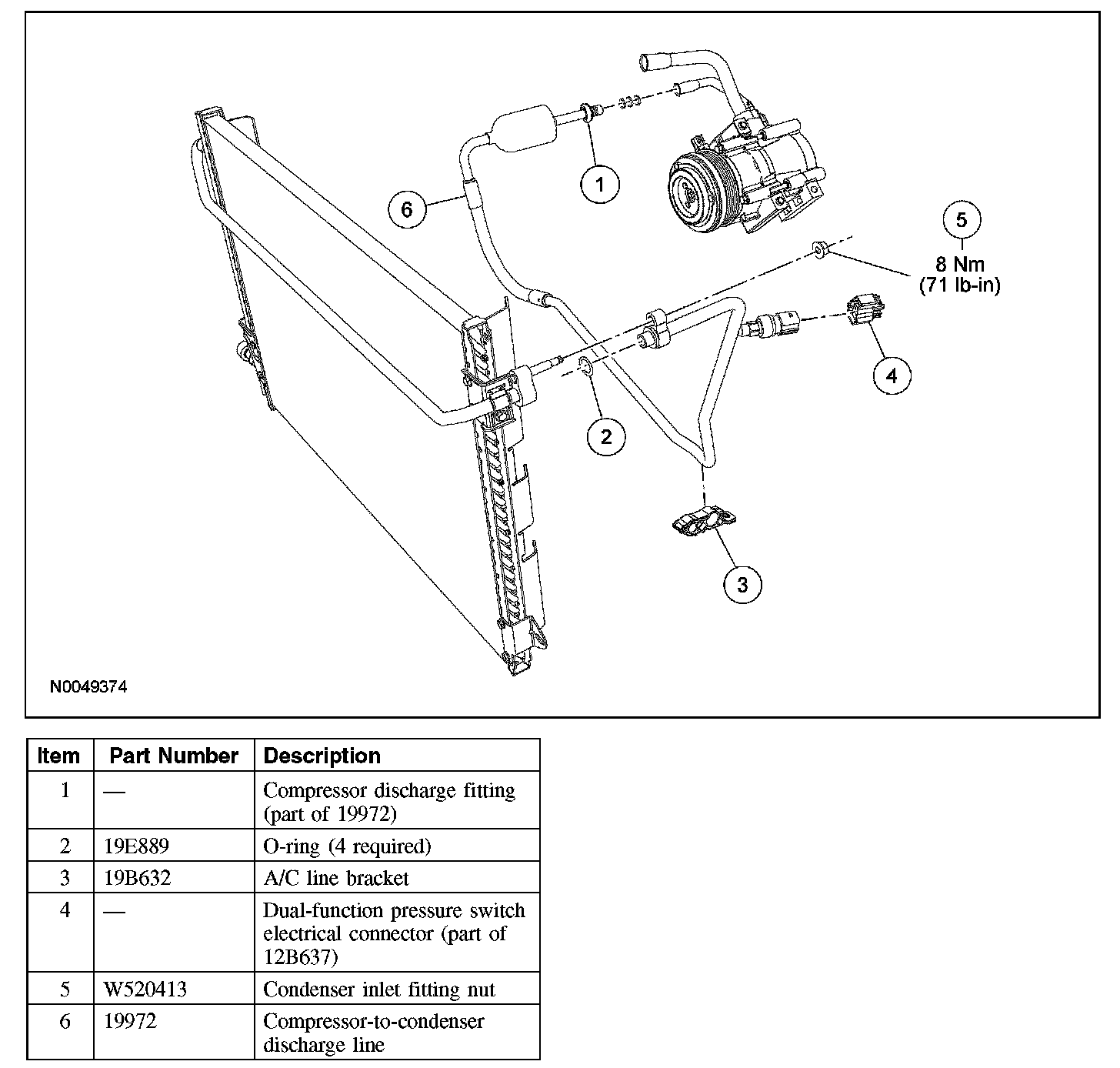 6. Remove the condenser inlet fitting nut and disconnect the fitting.