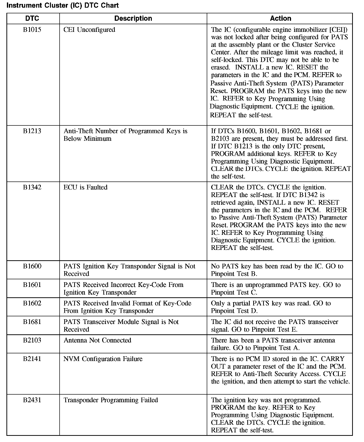 Instrument Cluster (IC) DTC Chart