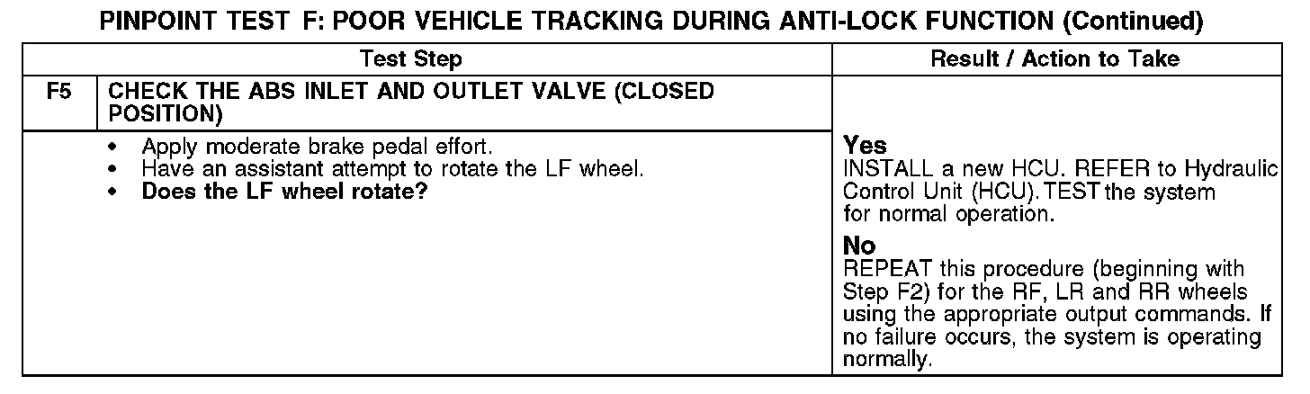 Pinpoint Test F: Poor Vehicle Tracking During Anti-lock FunctionRefer to Vehicle Dynamic Systems for schematic and connector information.