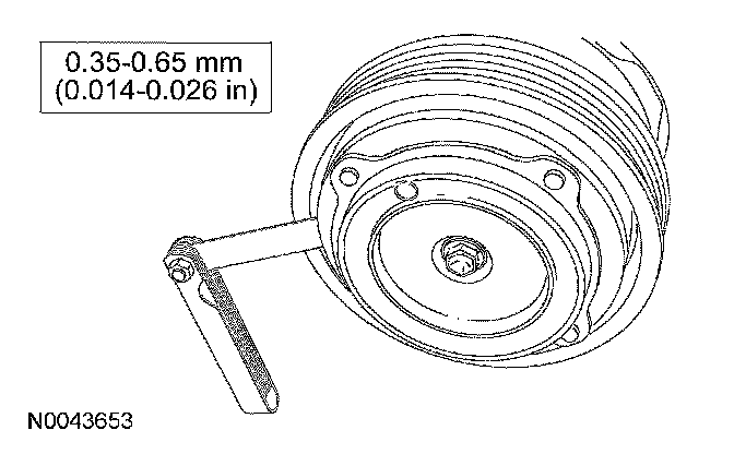 - Measure the clutch air gap at 3 equally spaced locations around the A/C compressor pulley and calculate the average.
