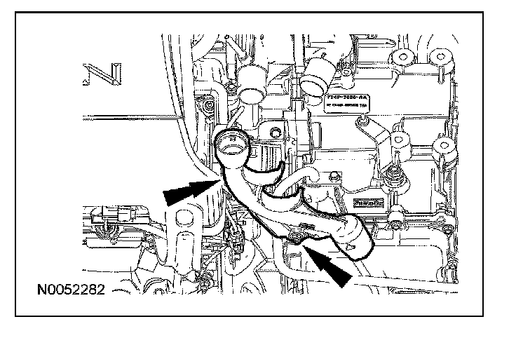 8. Remove the coolant hoses from the transmission fluid filler tube.