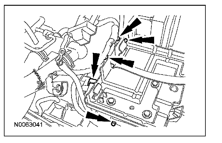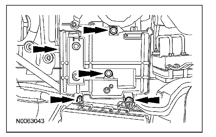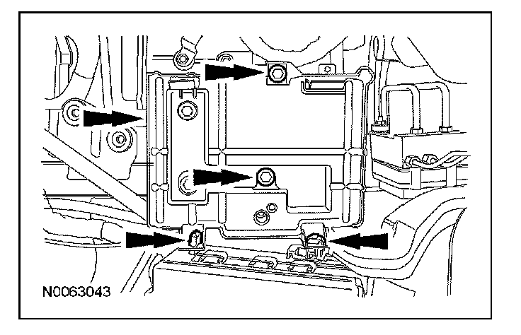 13. Remove the 2 upper battery tray bolts and release the power distribution box (PDB) fasteners and remove the battery tray and bracket.