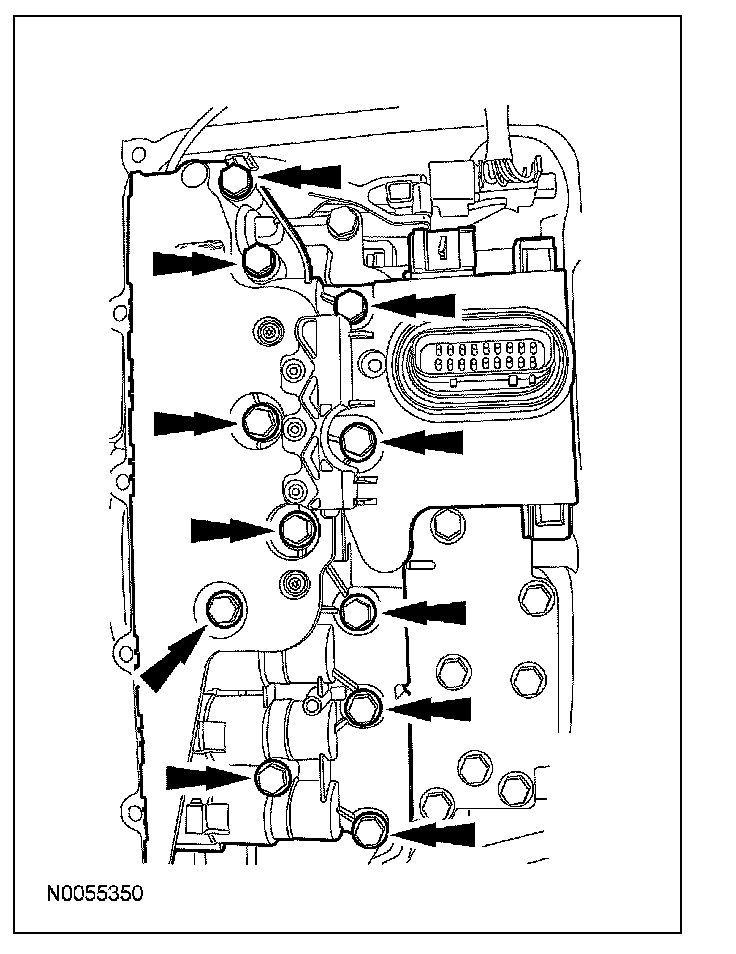 11. CAUTION: Inspect the 20-pin solenoid body connector seal to make sure that the seal is on the inside of the main control cover. Transmission fluid leak will occur.